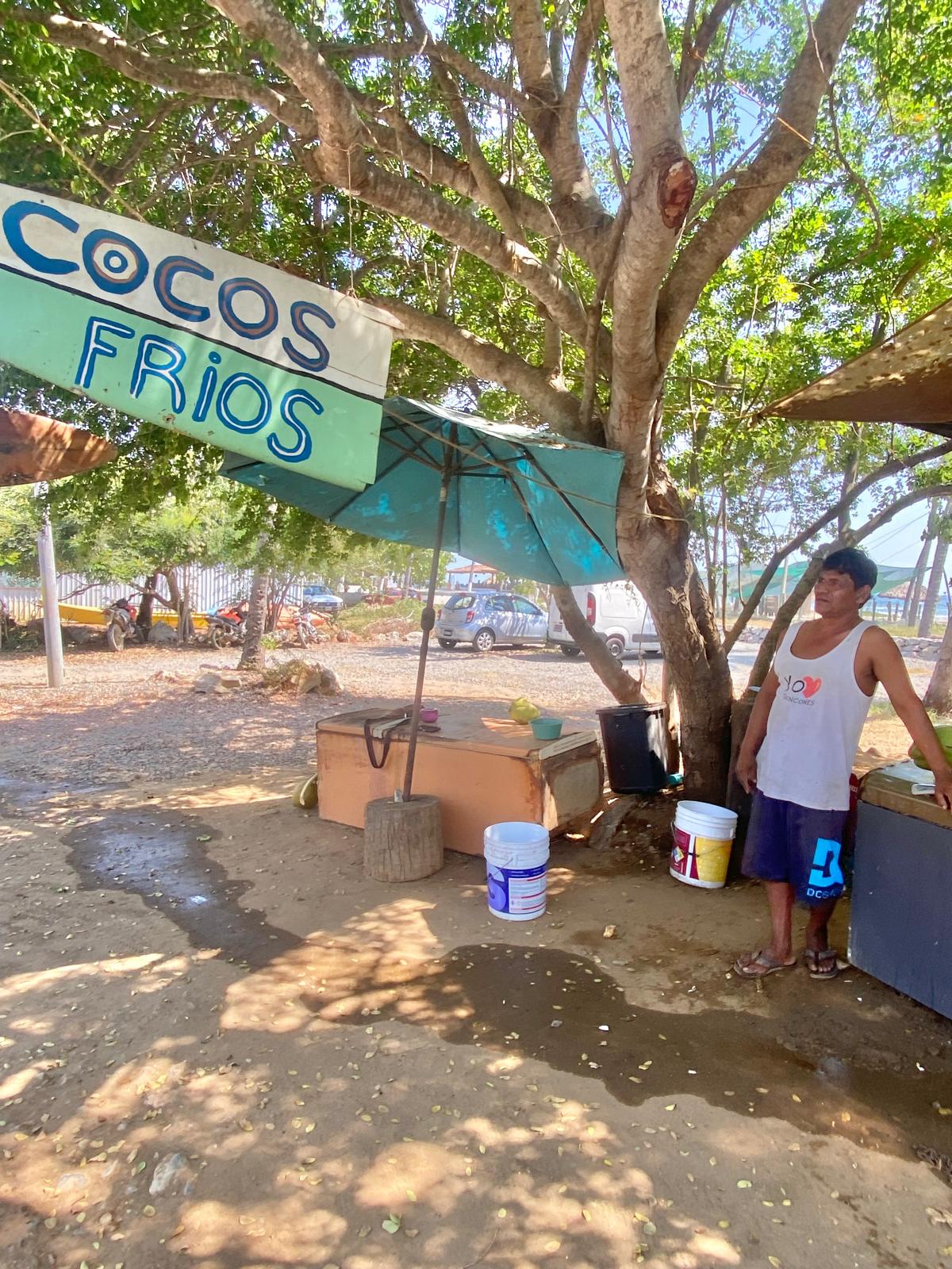 Just next to the first bridge in Troncones, under the trees, there’s a hand-painted COCOS FRIOS sign on an old surfboard. That’s where Lorenzo sets up each day, with a stack of green coconuts. His stand is as simple as it gets—two old refrigerators laid on their sides, doubling as both coolers and tables. He’s got a bit of shade, a machete, some buckets, some ice. It’s totally refreshing.