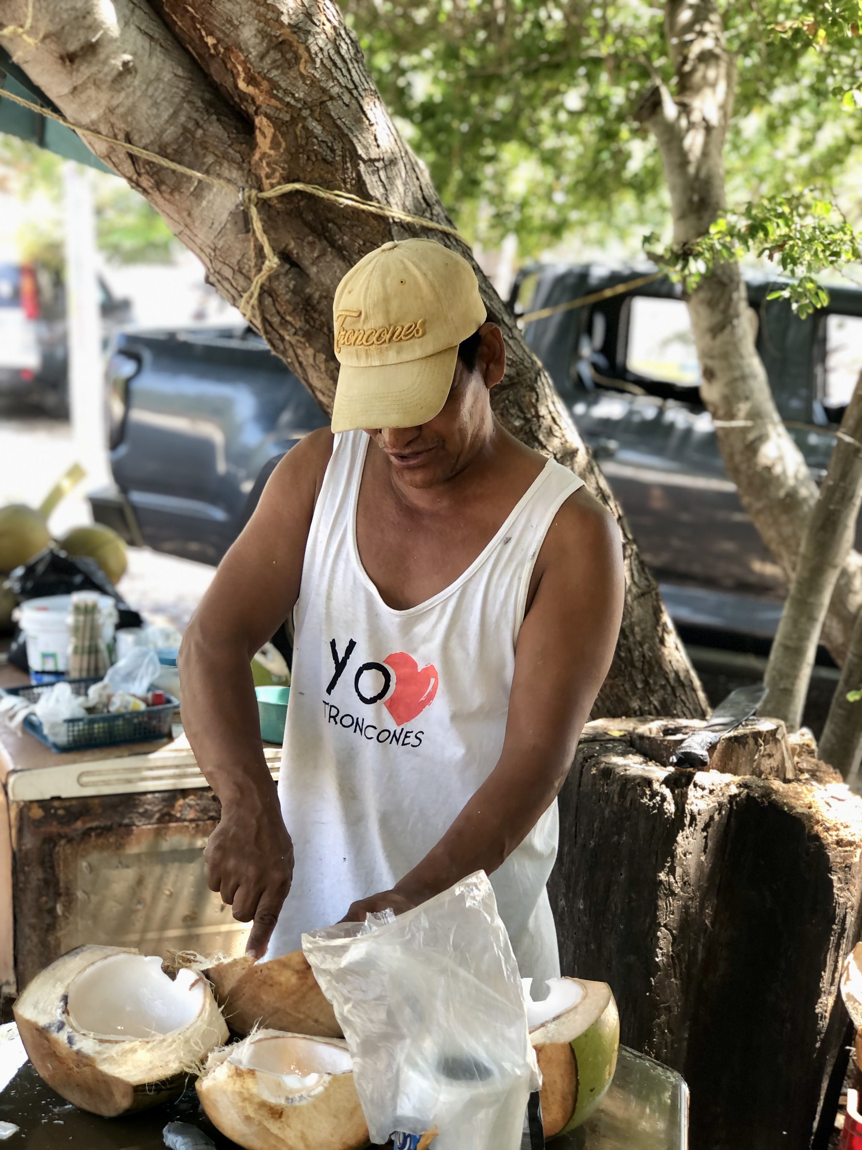 Lorenzo’s been at his spot about eight years. Originally from Troncones and now living in Lagunillas, he comes in each morning with 20 to 30 coconuts, all sourced locally. Some he’s been asked to cut; some are given. He’s selective.