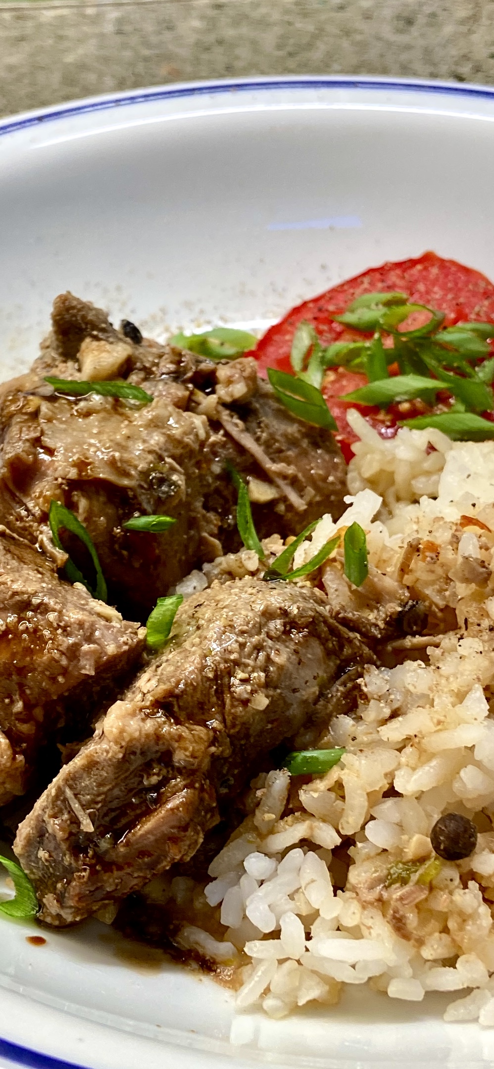 Marinate the pork: In a large bowl, combine the pork, soy sauce, vinegar, garlic, pepper, and bay leaves. Let it rest for at least 30 minutes, or refrigerate overnight for a deeper flavor. Sear the meat: Heat a heavy pot or Dutch oven. Lift pork from the marinade (reserve liquid) and sear until browned on all sides. Simmer low and slow: Pour the reserved marinade over the pork. Add ½–1 cup of water, just enough to cover the meat. Bring to a boil, then reduce heat to low, cover, and simmer for 45–60 minutes, until the pork is tender and infused with flavor. Finish and serve: Uncover and let the sauce reduce to your desired thickness. Taste and adjust with extra soy sauce or vinegar if needed. Serve hot over steamed rice.
