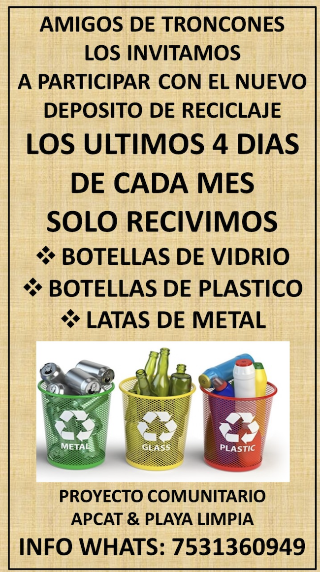 Playa Limpia has helped establish a collection center at the crest of the mountain road into Troncones (on your right on the way into town, on your left on the way out). It’s open the last four days of each month–for plastic bottles, glass bottles and metal cans. Bring your glass in thick bags, please. No cartons or paper, no broken plates or glassware, no windows, no styrofoam or single-use plastics. The collection center is open the last four days of the month, only.