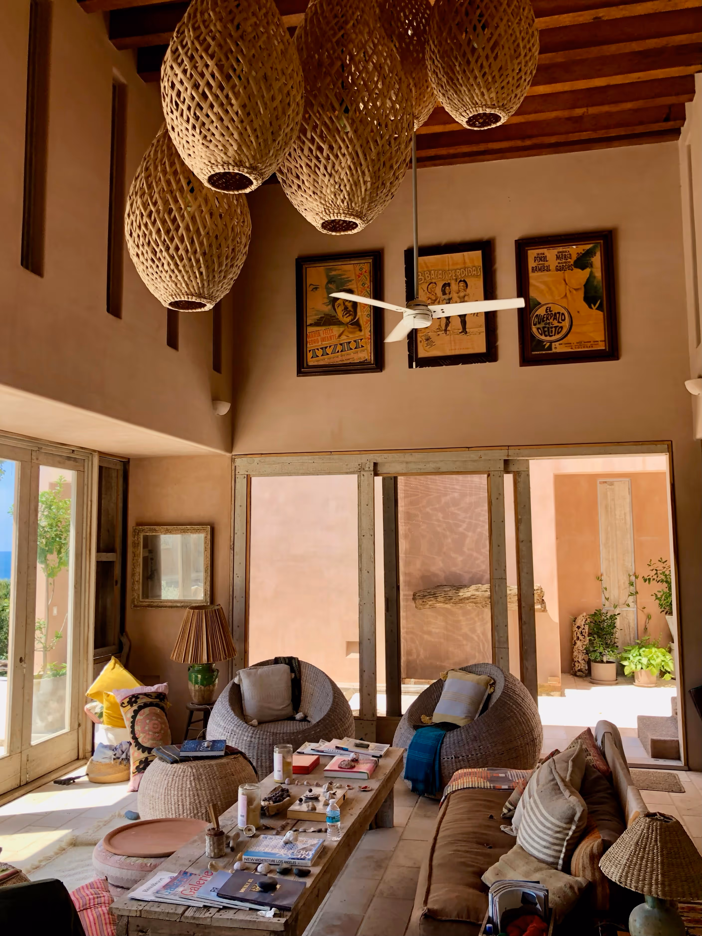 Looking back at her process, Christine said, âI was very clear about what I wanted for this living space. It needed to be a place where I could cook and talk to my friends, where people could sit anywhere in the room and we could all still make eye contact, unless somebody wanted to go jump in the pool. I didnât have a pool in LA. That was another priority and so were high ceilings, which I love in a climate like this because the heat can go up [said while she pointed up at the 24 narrow vertical windows that add visual interest and serve as vents] and the air can come in. This room is not designed to have air conditioning, as long as the air is moving and the fans are functioning, you donât need it.â