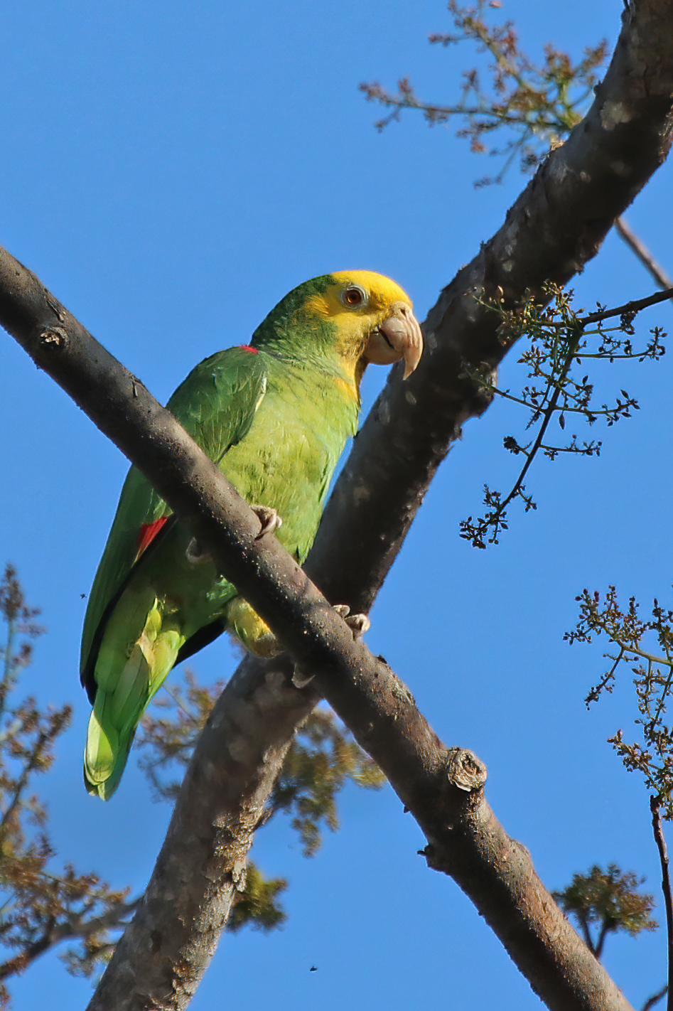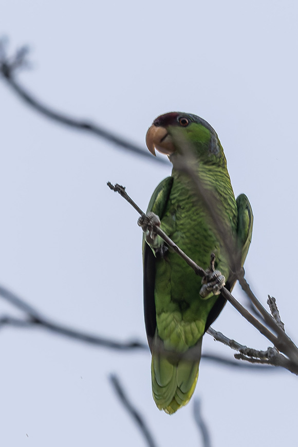 The yellow-headed Amazon is the largest of the three Amazon species in our area, and paradoxically, the hardest to find. If you’re expecting the noisy, conspicuous behavior of the white-fronts or the parakeets, the yellow-heads will fool you completely.