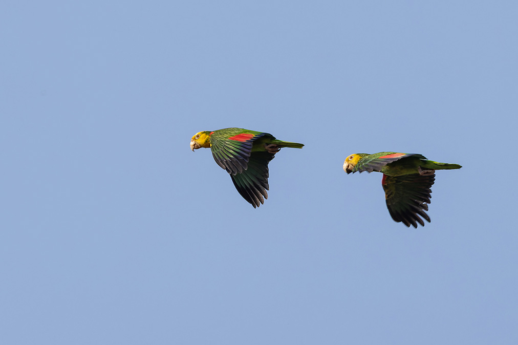 Yellow-headed Parrots in flight. Photo by William MertzAnd yet.