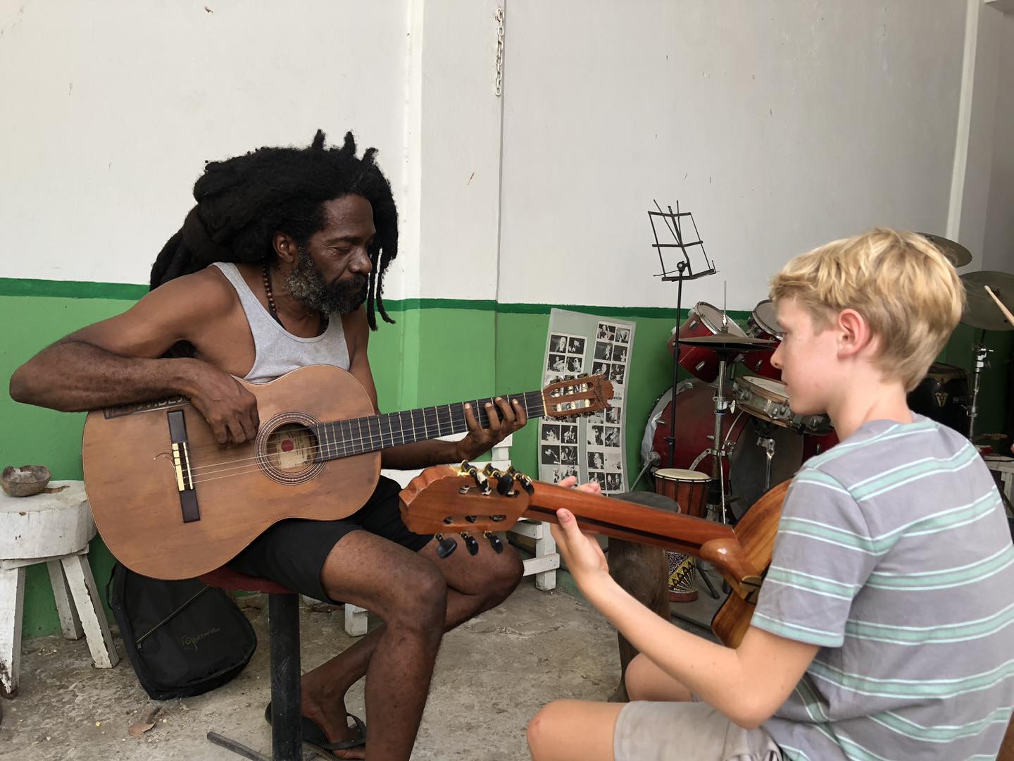 Aikeke: The people of Zihua. They saw me play and they asked me to teach their children. It started after the first couple days I was here. I was on the beach with a friend and this guy passed by with a marimba. My friend told him I could play, and the guy gave me the stick, you know, to play. And I played his marimba. And after that, within a day or two, he took me to teach his grandchildren. And then there was this guy who sells guitars. He saw me play and when I went to buy a guitar, he asked me to teach his son. Then he invited some of the other young guys, and we started.