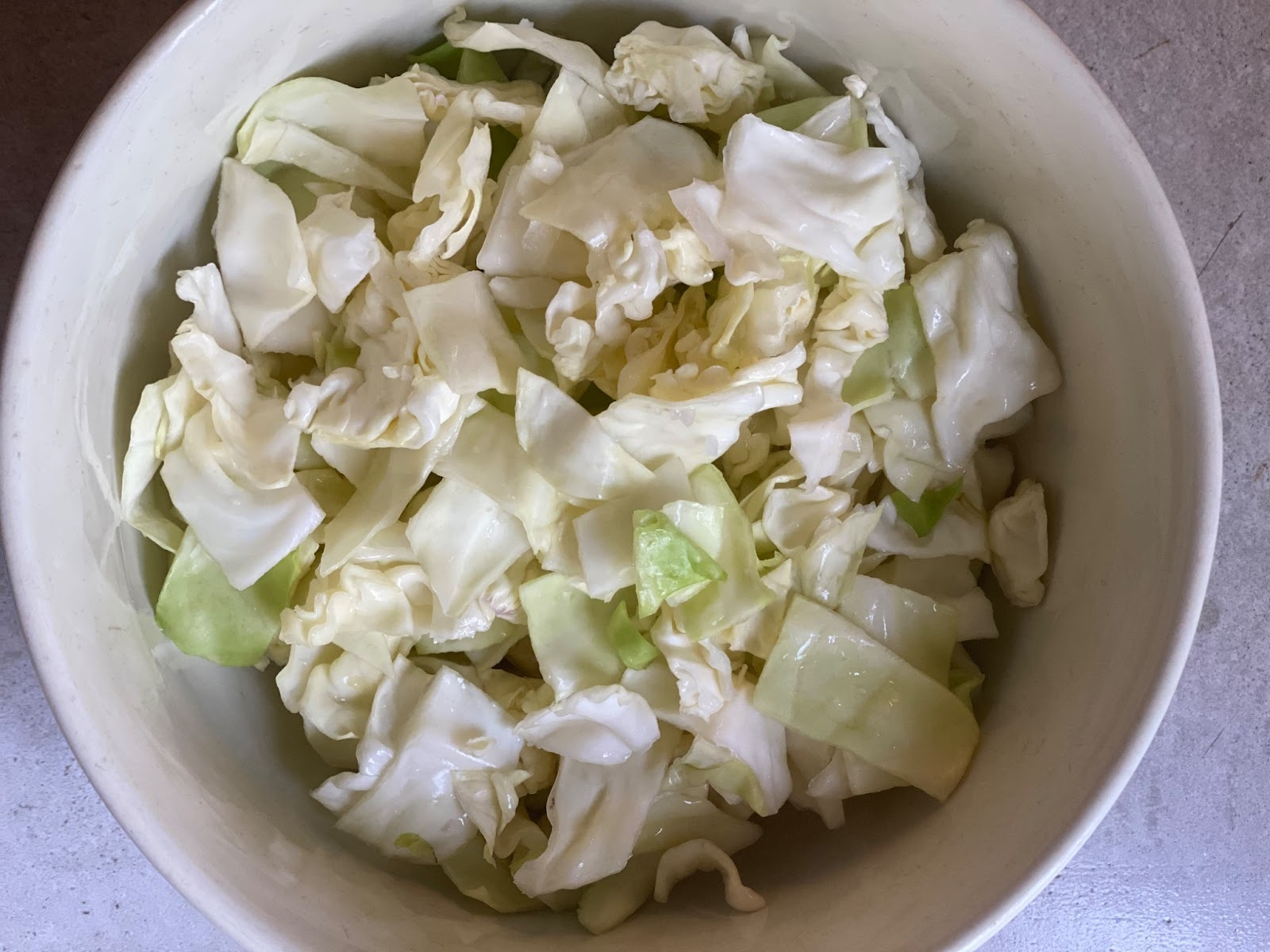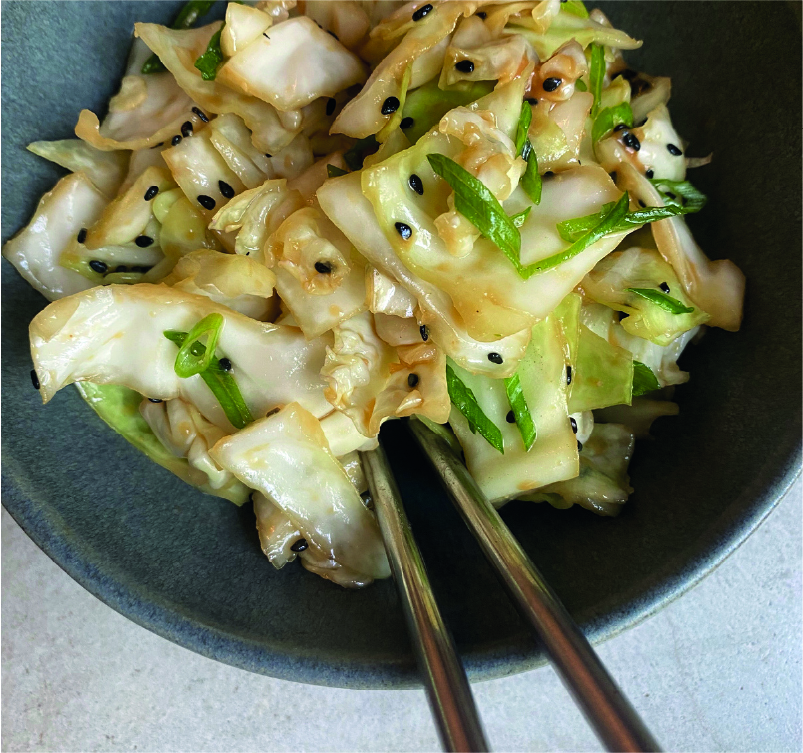 - Drain off any liquid from the salted cabbage. Add in a bunch of sliced scallions and a handful of toasted or black sesame seeds or toasted almonds for crunch.